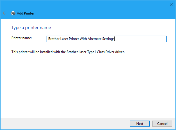 - Voer een naam in voor de printer en klik op "Volgende" om door te gaan. U kunt het een naam geven die u maar wilt, dus kies een naam die u helpt herinneren welke fysieke printer en afdrukinstellingen het zal gebruiken.
